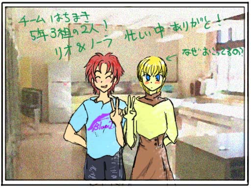シューズ 腹へった。死ぬよおれ。 ハリー 会議終わってから死ね。 キッド しょうがねーな。これやるよ。 シューズ サラミ? ハリー 腹にたまらねー! シューズ 意味ないよ。余計腹へるって。 キッド そんなことないって。うまいよサラミ。 GM 問題はうまいかまずいかじゃないだろうよ? シューズ 全部くれ。それで少しマシ。 GM 鼻血出るぞ。 ハリー キッドやばいじゃん。戦闘中、鼻血でまくり。 シューズ 鼻血キッド。 キッド いらねーならいいよ!せっかくやるって言ってんのに。 GM さて、そんな感じで、会議室。 ハリー みんないる?…じゃあ、今日の会議なんですけど…シューズ。 シューズ これ、プリントっす。 キッド 配りまーす。 スタン ありがとう。…これ、コピーだね?お金どうしたの? シューズ 自腹です。 ハリー オレの。 スタン いいの?少しは払うよ? ハリー いえ、いいです。うちらが勝手にやったことですんで。 スタン そう? ハリー で、プリント見てもらえばわかると思うんですけど、これからの予定表です。 スタン はい。 GM みんなそれぞれに見てるみたいだけど。 キッド えー、何か質問とか… GM 特にはないようだね。 ハリー これからこんな予定でやって行くんで、よろしくお願いします。 みんな はーい。 シューズ あと、はちまき係募集しないと。 キッド 後で5年から募集にしようぜ。今ここで言うとばれるって。 ハリー あと、6年か?上の人がいないと。 シューズ 5年と6年。何人くらい? キッド やりたくない人にやらせるのもな… シューズ ノーラどう? ハリー ノーラは、そういうの駄目じゃなかった? GM そんなことはないぞ。むしろ駄目なのはエミリア。 キッド そうなのか。 シューズ 応援団!あぶねー。忘れるとこだった。 ハリー 応援団は今募集するのか? キッド いいんじゃない? シューズ じゃあ、言っちゃいます。いいですか?応援団募集! スタン え?応援はみんなでやるんじゃないの? シューズ そうなんですけど、トップとして。なんかやりたいんス。 キッド やっぱ高学年の方がいいだろ。 シューズ じゃあ、高学年で…それ以外でもいいですけど。…募集! GM そうだな…じゃあ、5年で、同じクラスで合唱部のセシリアが。 セシリア それ、やりたいかもー。 シューズ いいね。…マルス派じゃなかった。 GM あと、3年生に一人、元気そうな男の子が。 男の子 オラやるぞ! シューズ オラ?やる気ありそう! ハリー オラだからな。 シューズ …6年生いませんか? GM 一人だけ。まあ、やっても良いよって感じで。 6年生 実行委員で忙しいから、あんまり出来ないかも知れないけどね。 シューズ いいっす。これで全員?じゃあ、おれも応援団なんで、よろし くお願いします。 キッド こんなもんか? ハリー そうだなー…えーと、今日は雨で練習が出来ないので、これで終わ りです。あと、5年と6年はちょっと残って下さい。 シューズ 応援団と、旗組も。 キッド 一応しめとく? ハリー えーと、オレらはやっぱ6年生に比べると頼りないと思うんです けど、こういうことなら出来るんで、オレらなりに頑張っていきたいと 思いますんで、トップ取るために頑張りましょう! スタン うん。 GM みんなそれぞれに頷いたりしてるよ。 ハリー じゃあ、気合いを…どくそー! みんな おー! ハリー 今日はこれで解散です。 シューズ 5年と6年は残って。 スタン なんだい? シューズ はちまき作りましょう。はちまき。 スタン え?自分達で? ハリー 金はオレたちが出しますんで。 スタン うーん、はちまきか…いいとは思うんだけど… キッド 練習とかつらくて無理だったらおれたちで作ってもいいし。 シューズ どうですか?どうよノーラ? GM いきなり振られて少し驚く。表情はほとんどかわらんけど。 ノーラ …作るのは、いい。 キッド マジで?お母さん平気? ノーラ …(頷く)。 シューズ やった。どうよ、5年3組のみんな?やる気のない5年3組! GM 女の子が一人… 女の子あたしいいよ。そーゆーの好きよ。 キッド お、やった、5年3組! シューズ 名前、なんて言うんですか? 女の子 リオ。よろしくっ! シューズ メモメモ…。よろしく、リオ!
