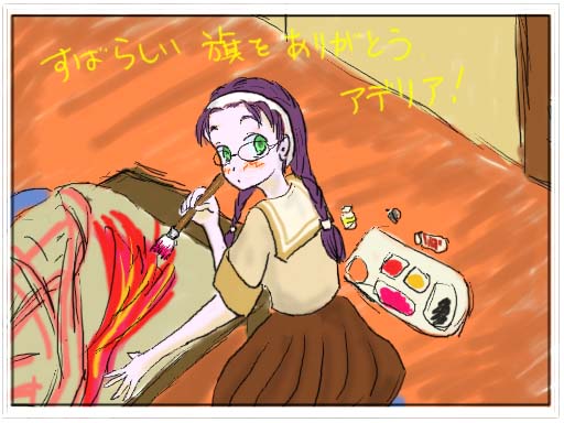 GM 5分休みとかに行動しなくて良いね?ティニーは、5分休みにも 飛び回っている。 シューズ じょーほーや!! ティニー はいはい、何でしょう! シューズ これは情報屋と言うより、ティニーに話があるんだけど。 ティニー え〜、なに〜? シューズ これはまたトーンが下がったね。新聞を作らなきゃいけないん だけど、おれ達。 ティニー …あったねえ、そんなもん。 シューズ 28日ダメ? ティニー …土日なら、いい。 シューズ おれは日曜はいける。…あと、サッカー野郎は。 ティニー ロベルト?…ロベルト!! ロベルト …はいはいはい。 シューズ いける?新聞。28日。 ロベルト おれは全然平気だよ。なに?そんな忙しいの? シューズ なんか忙しくて…。 ティニー 話は終わった?オッケー?…じゃ! ハリー 金にならん話には興味なしか。 キッド いったい、5分の間に何を… ティニー 教えてあげようか?10$。 キッド いいや。メルとマルスはどうだ? マルス 次の反応は何かあるか? キッド あいつらちゃんとやってるよ!!地球のために。 GM で、マルスはジュディの方も気にかけ始めているようだ。 マルス ジュディ…君の長い髪…素敵だね。 シューズ 何だよ!急にだよ。 ジュディ あははは… マルス やっぱり、髪の長い人って…きれいに見えるよね。 ジュディ あははは… キッド 遠くから、「どういう意味だ!!」て、言ってやれ。 マルス 今回は、君のために走るよ。 ジュディ あのー…できれば、わたしのためだったら、負けてほしいなー …なんて… シューズ …マルス、ちょとやめな。いやがってるじゃないか。 マルス おや?がんばってるかい、リーダー。 シューズ がんばってるよ、リーダーは。 マルス 忙しいそうだね。 シューズ そうだよ。 マルス ほら、アデリアが話しかけたそうにしてるよ。 シューズ え? マルス ジュディ… ハリー で、アデリアはどんな用事? GM アデリアは、言いたげだけど言っちゃダメかな…ていう、いつもの アデリアです。 ハリー オレは人の心が読めないから、言ってくれないと。 アデリア あ、あ…あの、し、下書きが…半分ぐらい上がったんだけど… キッド すごいじゃん。 アデリア で、デザインを少し変えて…や、休み時間とかにみんなと話した けど…結構、賛成が取れたから、言おうと思って…でも、今変えたらわるい かな、と思って… ハリー 全然。オレ達見てないし、絵は任せてあるから。 アデリア ほんと? ハリー どんどんやっていってよ。 アデリア わかった! GM うれしそうです。